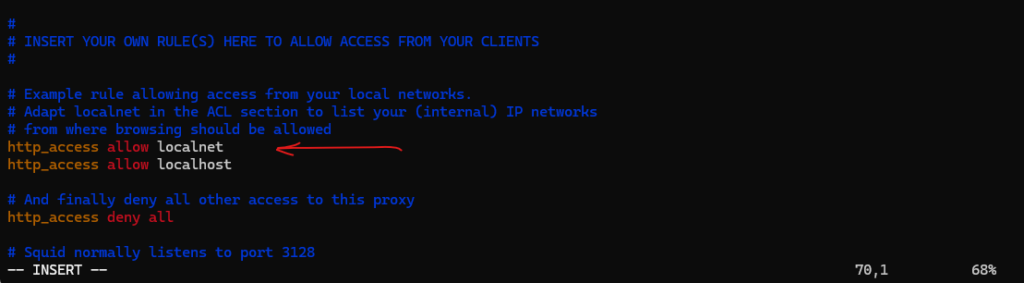 The http_access allow localnet at the end of the file we can also comment but finally this access rule will be ignored because of our previously added http_access deny !allowed_https_sites rule which already block all pages besides *.matrixpost.net.