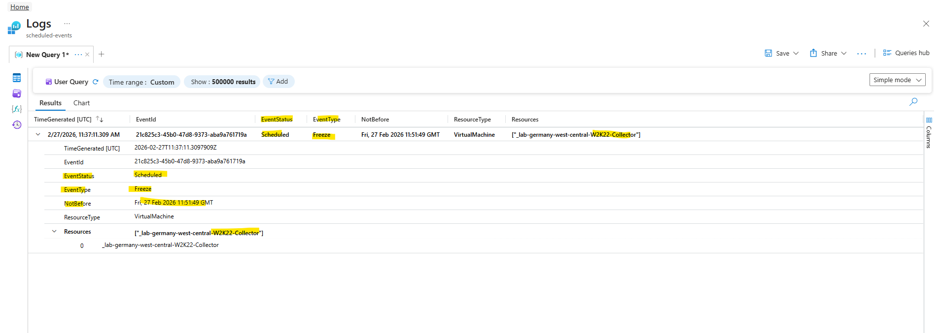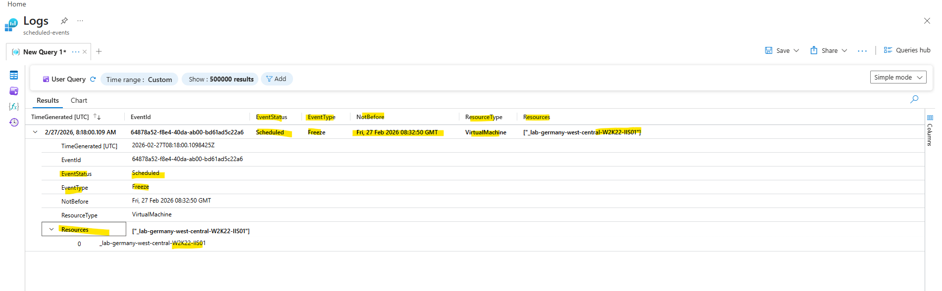 Here we see the scheduled event that Azure actually emitted for one of our VMs (lab-germany-west-central-W2K22-IIS01), in this case a Freeze event, which tells us that the platform is planning to suspend the VM at some point after the “NotBefore” time. The query shows the event type, resource ID, and the earliest timestamp Azure will begin the maintenance, which our collector correctly captured using the Scheduled Events API as described. This proves our monitoring setup works end-to-end by alerting us before an anticipated host maintenance action.