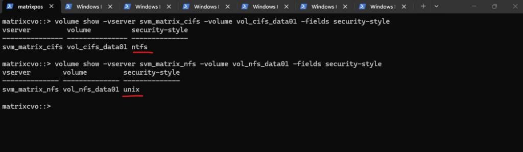 # volume used for cifs/smb shares matrixcvo::> volume show -vserver svm_matrix_cifs -volume vol_cifs_data01 -fields security-style # volume used for nfs shares (exports) matrixcvo::> volume show -vserver svm_matrix_nfs -volume vol_nfs_data01 -fields security-style