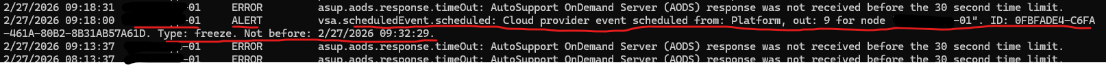 2/27/2026 09:18:00 matrixcvo-01 ALERT vsa.scheduledEvent.scheduled: Cloud provider event scheduled from: Platform, out: 9 for node "matrixcvo-01". ID: 0FBFADE4-C6FA-461A-80B2-8B31AB57A61D. Type: freeze. Not before: 2/27/2026 09:32:29.