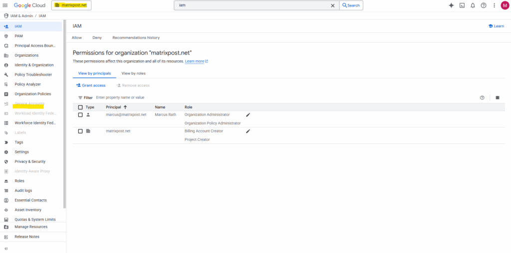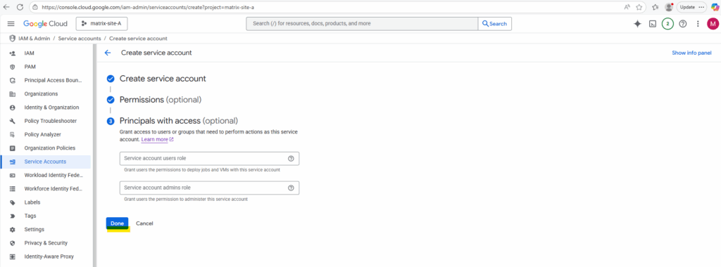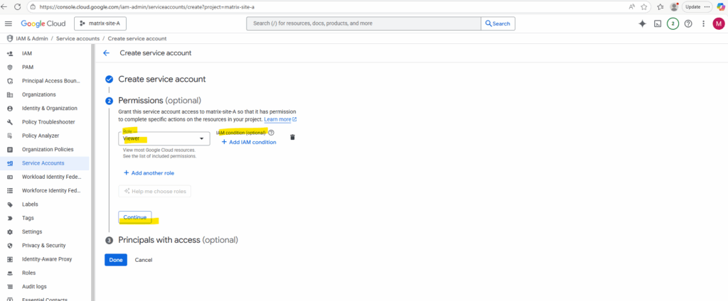 Below under Principals with access (optional) we can also grant, change, and revoke a principal’s access to a single service account.