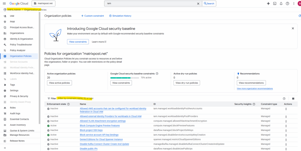 When your Google Cloud setup is tied to a Cloud Identity organization, Google applies a set of default organization policies for security and governance, even if you didn’t manually configure them.