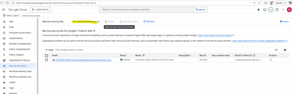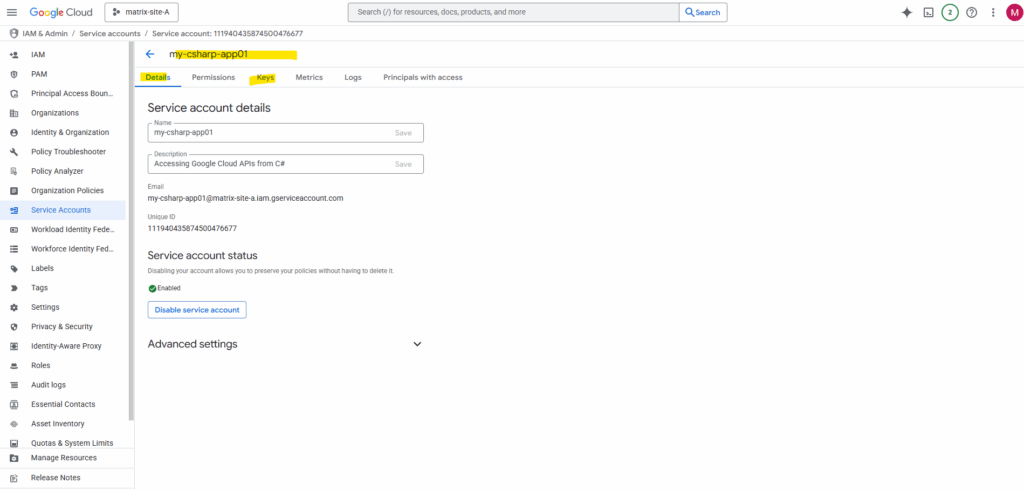 Click on the service account to browse to its details page. Here switch to the Keys tab.