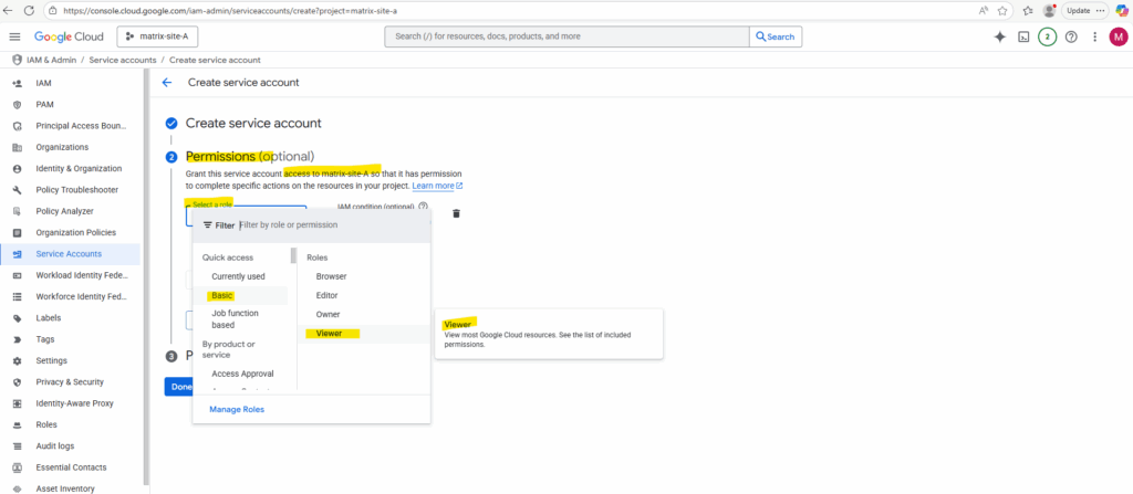 To create new service accounts we need the “roles/iam.serviceAccountCreator” IAM role on the project.
