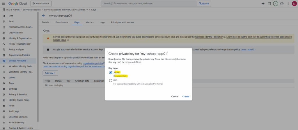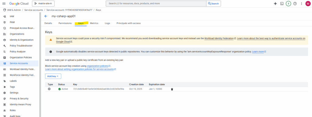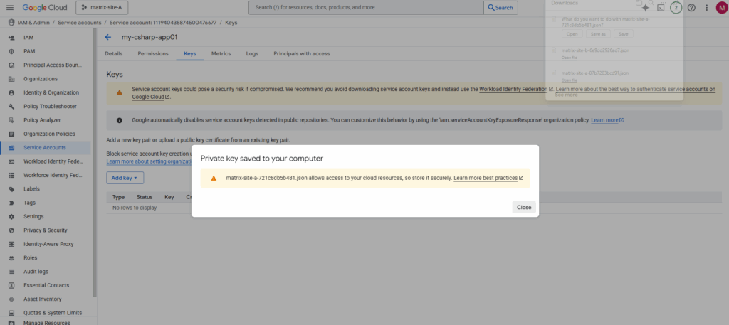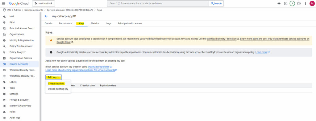 We recommend you avoid downloading service account keys and instead use the Workload Identity Federation .