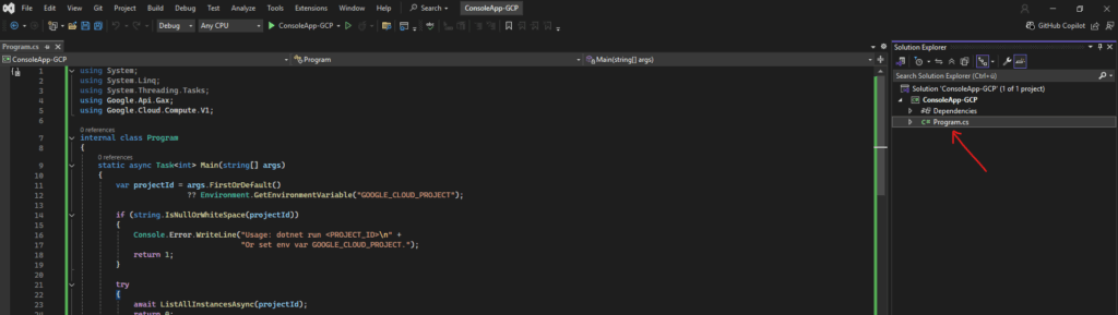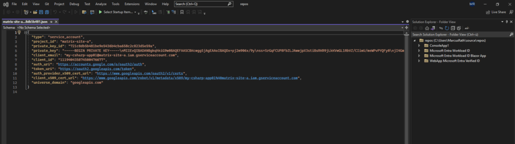 I will place the service account JSON file directly into the same path as our program.cs file, so we can just reference the JSON file with a relative path instead of the full absolute one.