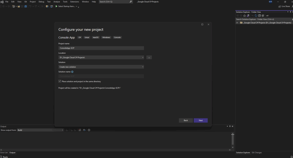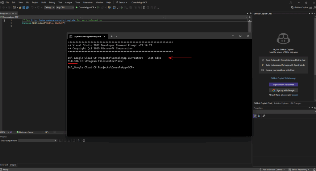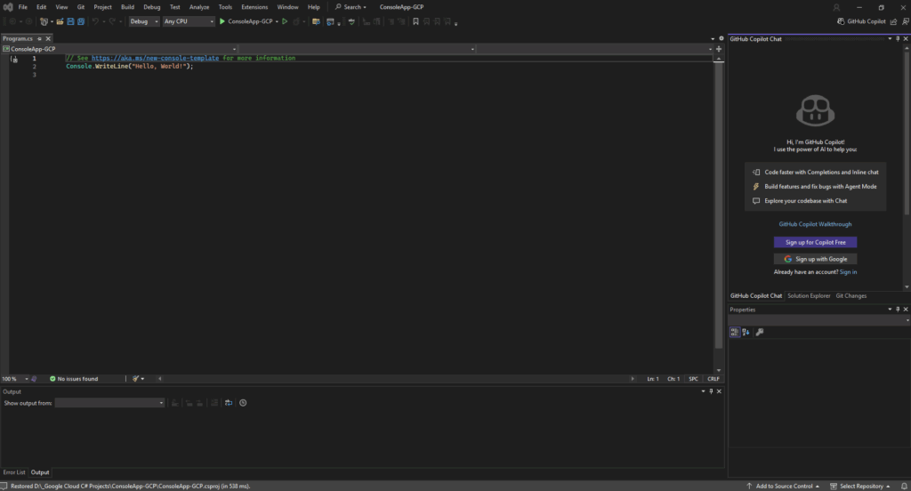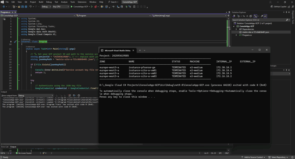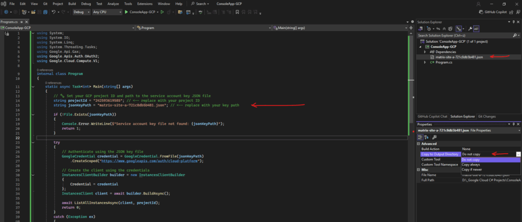 So we should copy the JSON key file into that same output folder, or tell Visual Studio to copy it automatically on build. Right-click the JSON file → Properties, set “Copy to Output Directory” → Copy always or Copy if newer.