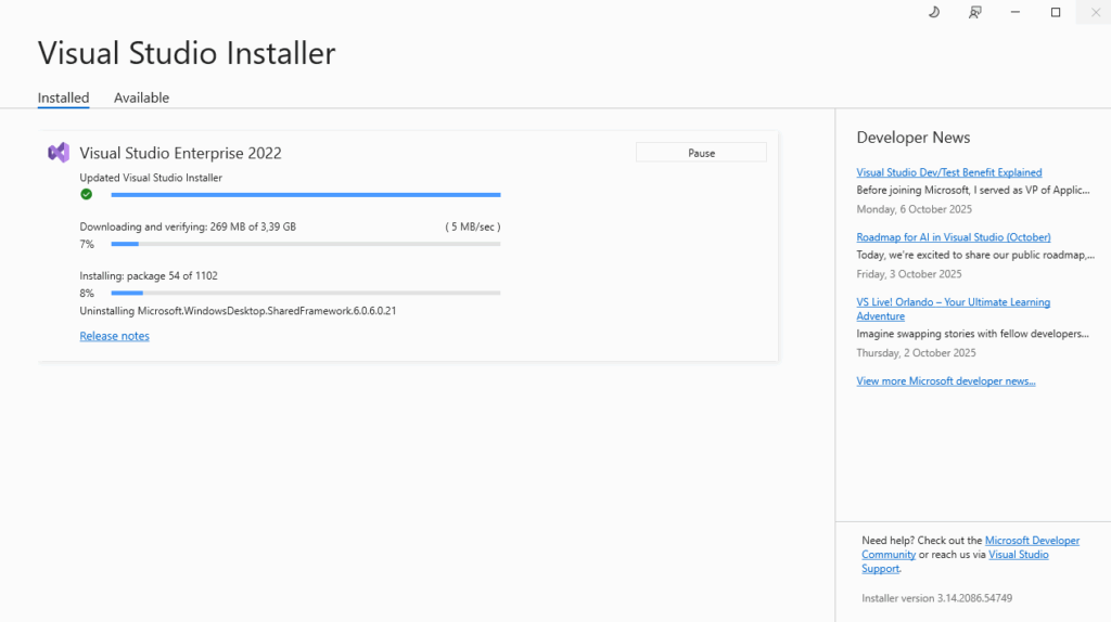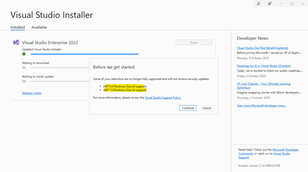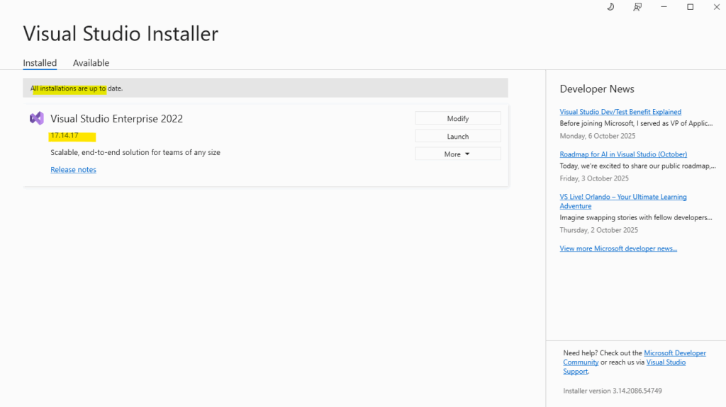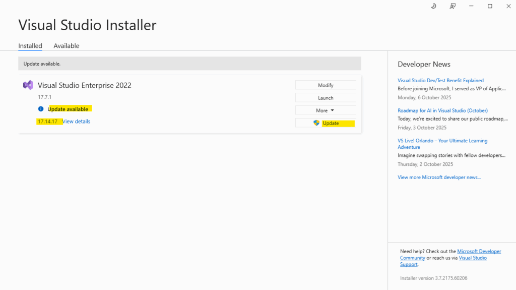 So I will first have to also update Visual Studio. Therefore open the Visual Studio Installer to see if there are new update available. Looks good and in my case I can update to version 17.14.17.