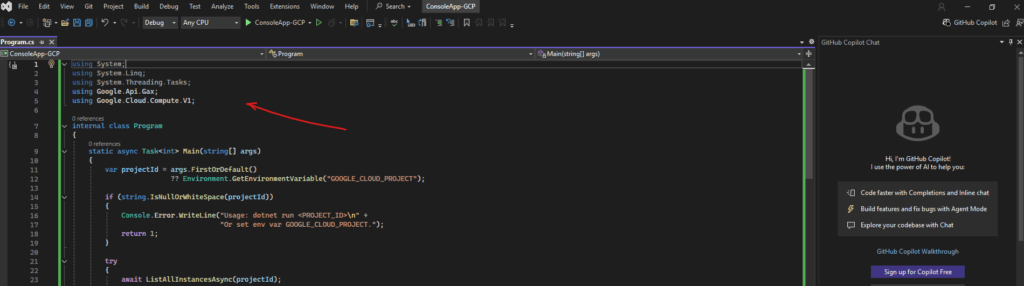 In contrast, third-party libraries such as Google.Api.Gax or Google.Cloud.Compute.V1 shown below as red underlined errors, aren’t included by default.
