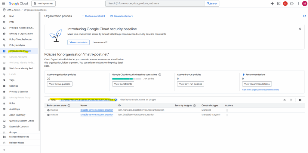 constraints/iam.disableServiceAccountCreationpolicy in Google Cloud IAM, we’ll need at minimum the following IAM role: roles/orgpolicy.policyAdminSource: https://cloud.google.com/iam/docs/troubleshoot-org-policies