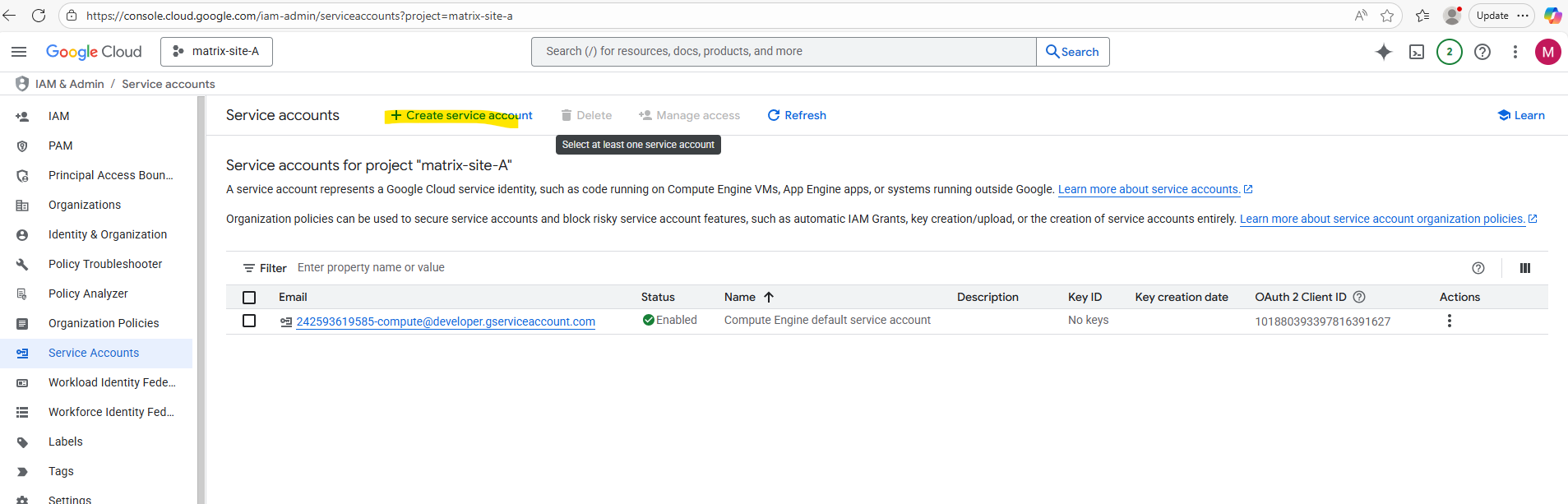 Click on the service account to browse to its details page. Here switch to the Keys tab.