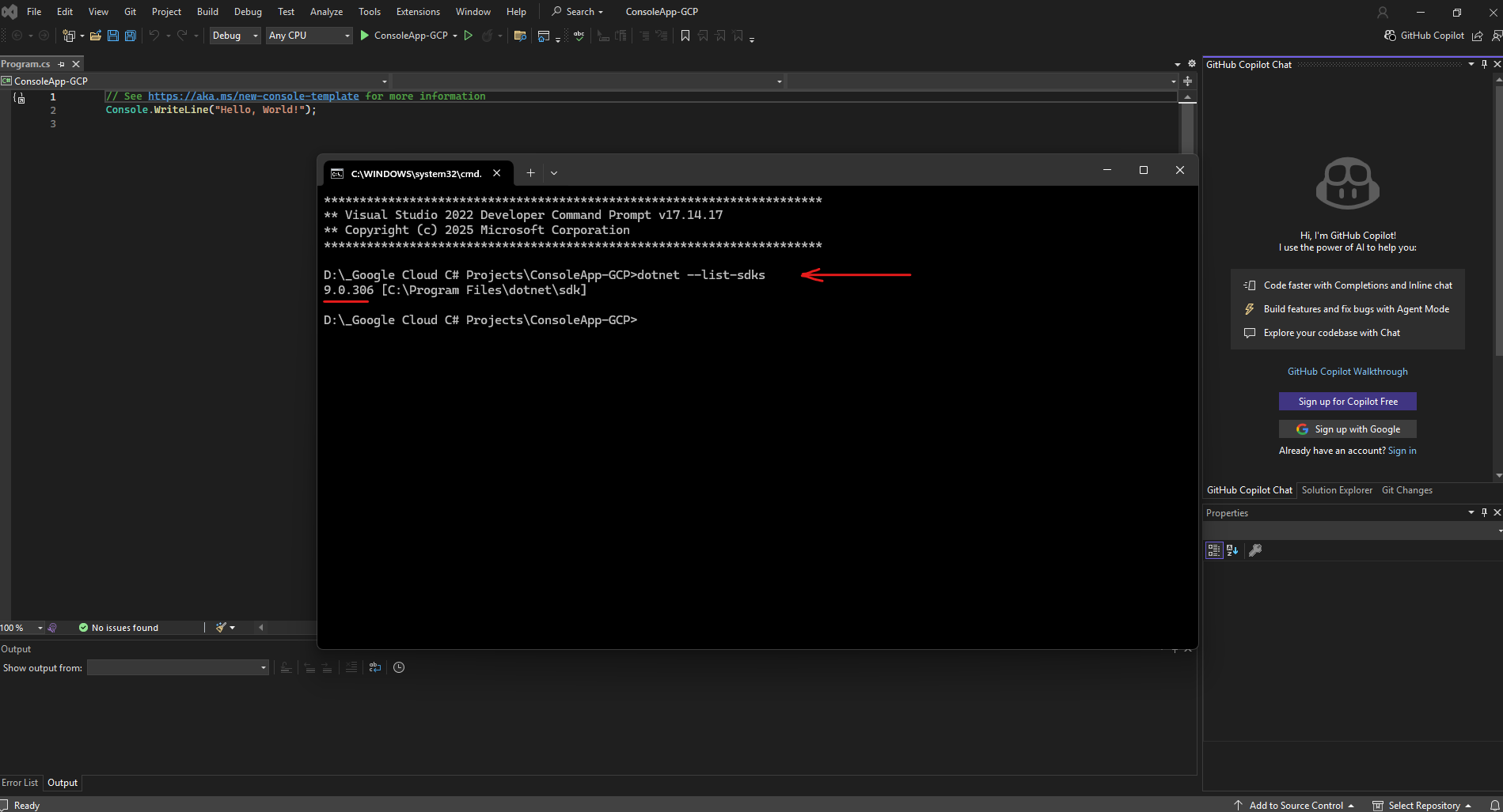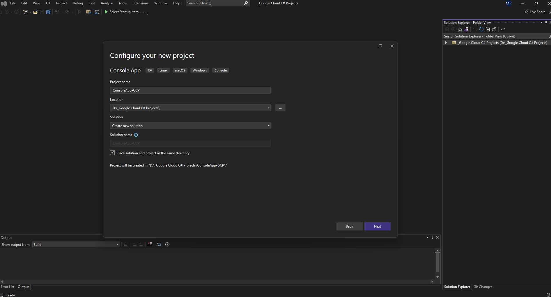So we should copy the JSON key file into that same output folder, or tell Visual Studio to copy it automatically on build. Right-click the JSON file → Properties, set “Copy to Output Directory” → Copy always or Copy if newer.