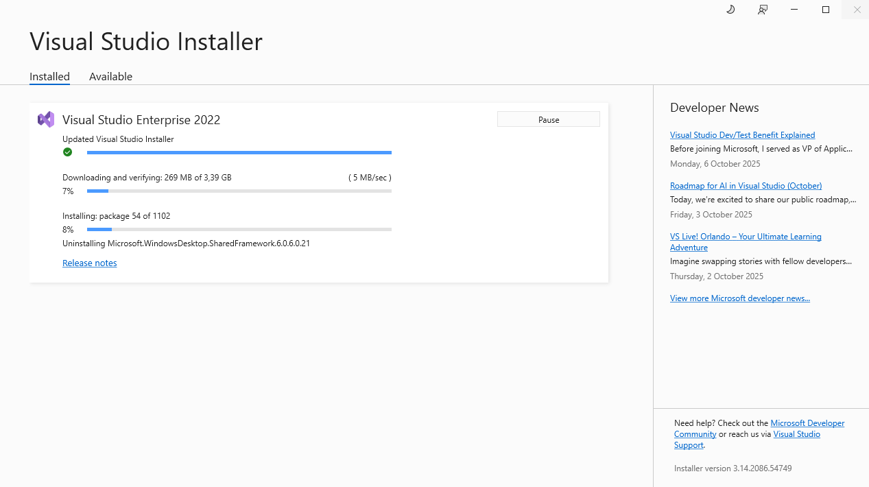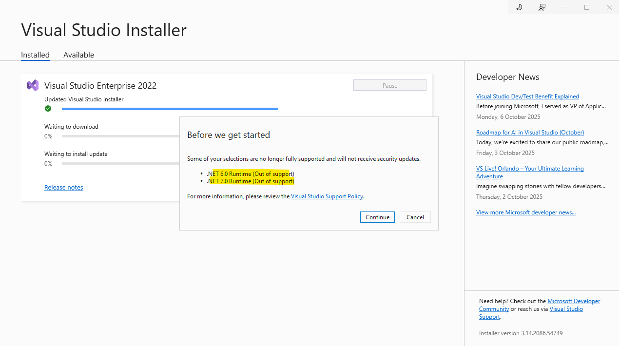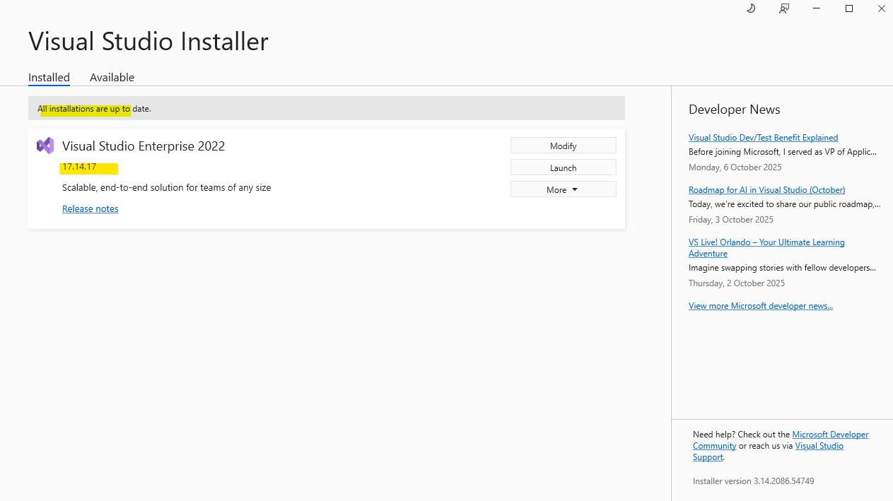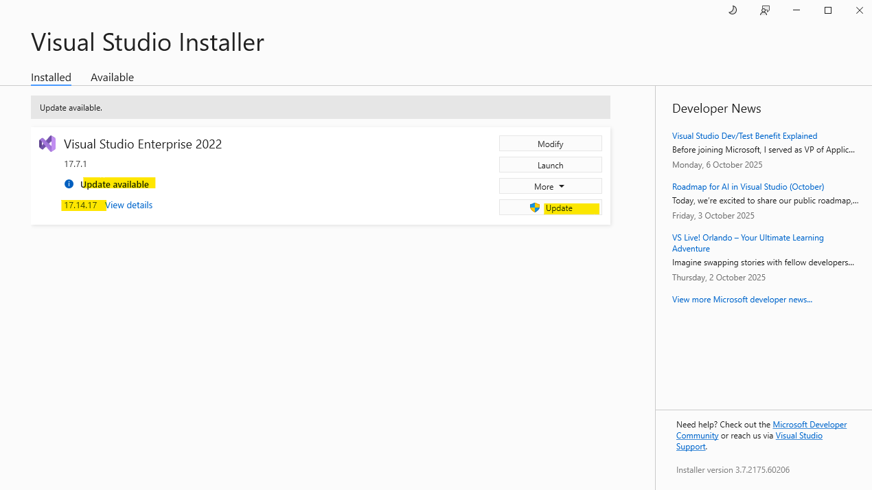So I will first have to also update Visual Studio. Therefore open the Visual Studio Installer to see if there are new update available. Looks good and in my case I can update to version 17.14.17.
