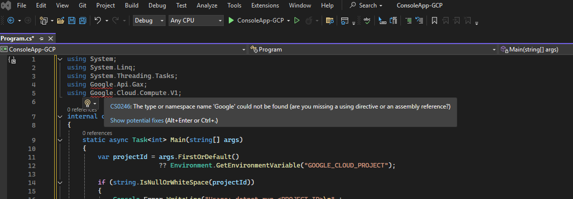 In contrast, third-party libraries such as Google.Api.Gax or Google.Cloud.Compute.V1 shown below as red underlined errors, aren’t included by default.